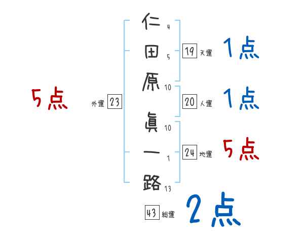 天運![]() | 仁田原眞一路さんの天運は19画の1つ星!優れた才能を持ちますが、協調性が足りないことも。周りの人と協力する事を意識しましょう。 家系が持つ宿命的な運勢を表します。祖先から受け継いだ苗字ですので自分の力が及びません。家柄を象徴します。 |