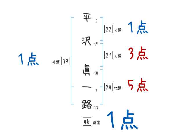 外運![]() | 平沢眞一路さんの外運は19画の1つ星!優れた才能を持ちますが、協調性が足りないことも。周りの人と協力する事を意識しましょう。 生活面を象徴する運勢です。外部から受ける影響力を表し、結婚運、家庭運や職場、環境への順応性を表します。 |