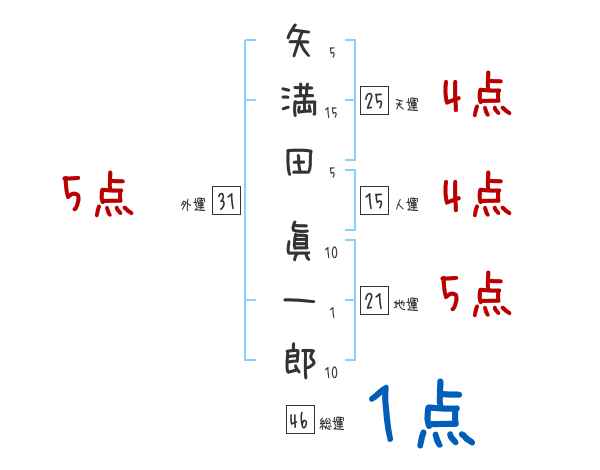 外運![]() | 矢満田眞一郎さんの外運は31画の5つ星!社交性があり判断力に優れる。順風満帆な人生で円満な生活。 生活面を象徴する運勢です。外部から受ける影響力を表し、結婚運、家庭運や職場、環境への順応性を表します。 |
