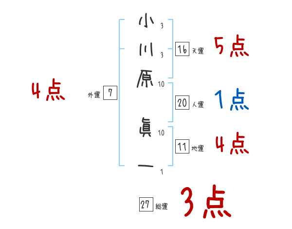 外運![]() | 小川原眞一さんの外運は7画の4つ星!強い意志や信念を持ち独立心が強い。自立する。 生活面を象徴する運勢です。外部から受ける影響力を表し、結婚運、家庭運や職場、環境への順応性を表します。 |
