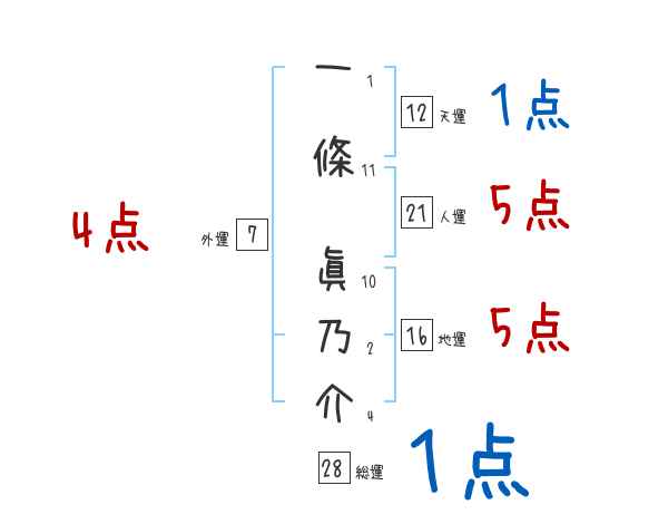 | 外運  | 一條眞乃介さんの外運は7画の4つ星!強い意志や信念を持ち独立心が強い。自立する。生活面を象徴する運勢です。外部から受ける影響力を表し、結婚運、家庭運や職場、環境への順応性を表します。 |