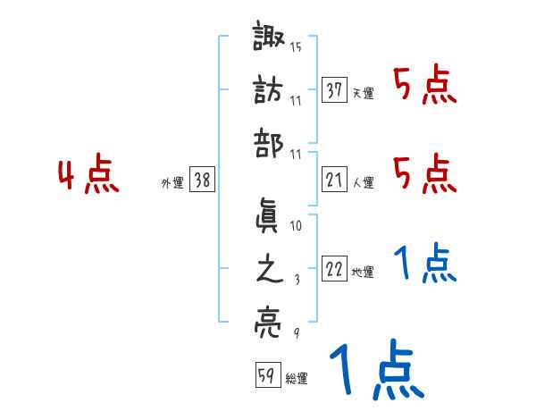 人運![]() | 諏訪部眞之亮さんの人運は21画の5つ星!統率力がある。独立し成功する。名誉を手に入れる。 性格や才能などを表す2番目に重要な運勢です。人間関係や協調性、社会的な成功に影響します。主に20歳から50歳ぐらいまでの中年期の運勢を表します。 |