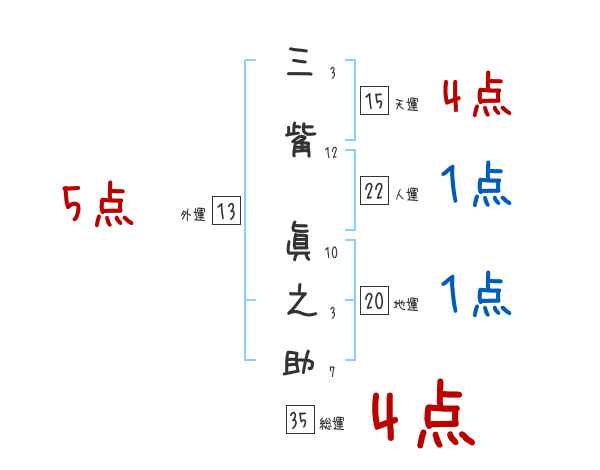 総運![]() | 三觜眞之助さんの総運は35画の4つ星!温厚な性格で感受性が高い。穏和な性格で人望が厚い。 あなたの人生を表す1番重要な運勢です。生涯を通じて影響する総合運となり、主に50歳以降の晩年期に影響を及ぼします。 |