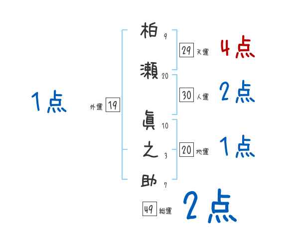 天運![]() | 柏瀬眞之助さんの天運は29画の4つ星!完全主義で才能がある。厳格な心の持ち主。 家系が持つ宿命的な運勢を表します。祖先から受け継いだ苗字ですので自分の力が及びません。家柄を象徴します。 |