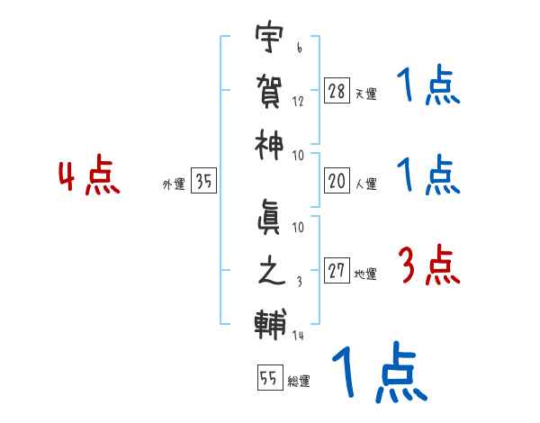 | 人運  | 宇賀神眞之輔さんの人運は20画の1つ星!社交が苦手。人とは違った才能があり波乱万丈な人生かも。性格や才能などを表す2番目に重要な運勢です。人間関係や協調性、社会的な成功に影響します。主に20歳から50歳ぐらいまでの中年期の運勢を表します。 |