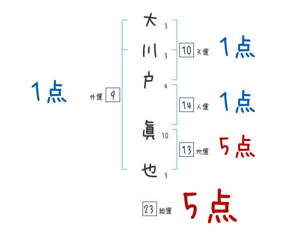 天運![]() | 大川戸眞也さんの天運は10画の1つ星!不安を感じやすい傾向。ストレスを抱えないように注意しましょう。 家系が持つ宿命的な運勢を表します。祖先から受け継いだ苗字ですので自分の力が及びません。家柄を象徴します。 |