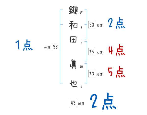 天運![]() | 鍵和田眞也さんの天運は30画の2つ星!浮き沈みの激しさに注意しましょう。 家系が持つ宿命的な運勢を表します。祖先から受け継いだ苗字ですので自分の力が及びません。家柄を象徴します。 |