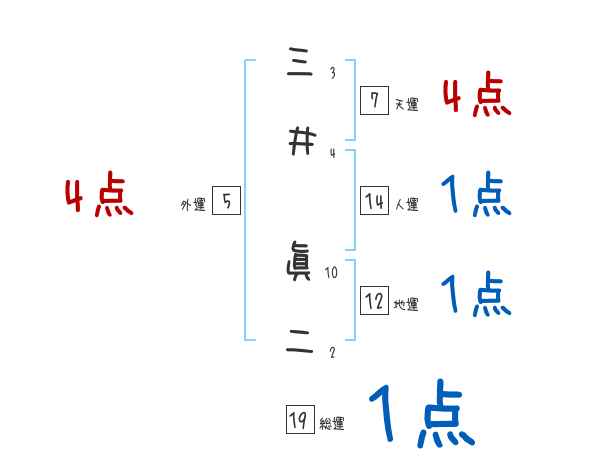 天運![]() | 三井眞二さんの天運は7画の4つ星!強い意志や信念を持ち独立心が強い。自立する。 家系が持つ宿命的な運勢を表します。祖先から受け継いだ苗字ですので自分の力が及びません。家柄を象徴します。 |