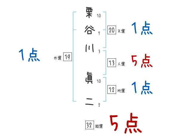 総運![]() | 栗谷川眞二さんの総運は32画の5つ星!柔軟性があり成功する。チャンスが多く金運が良い。 あなたの人生を表す1番重要な運勢です。生涯を通じて影響する総合運となり、主に50歳以降の晩年期に影響を及ぼします。 |