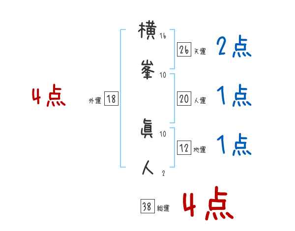 天運![]() | 横峯眞人さんの天運は26画の2つ星!波瀾万丈かも。信頼できる人を大事にしましょう。 家系が持つ宿命的な運勢を表します。祖先から受け継いだ苗字ですので自分の力が及びません。家柄を象徴します。 |