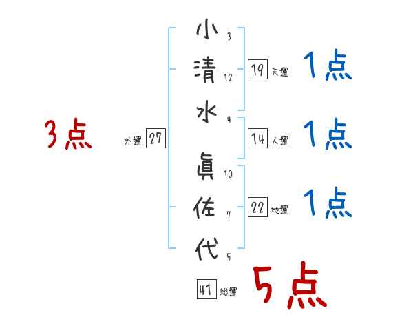 外運![]() | 小清水眞佐代さんの外運は27画の3つ星!頭脳明晰だが強情で摩擦が多い傾向。孤立に注意。 生活面を象徴する運勢です。外部から受ける影響力を表し、結婚運、家庭運や職場、環境への順応性を表します。 |