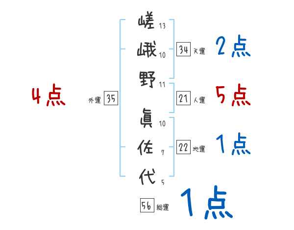総運![]() | 嵯峨野眞佐代さんの総運は56画の1つ星!消極的で無気力になりがち。誠実な気持ちが必要でしょう。 あなたの人生を表す1番重要な運勢です。生涯を通じて影響する総合運となり、主に50歳以降の晩年期に影響を及ぼします。 |