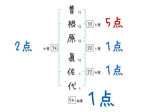 天運![]() | 曽根原眞佐代さんの天運は32画の5つ星!柔軟性があり成功する。チャンスが多く金運が良い。 家系が持つ宿命的な運勢を表します。祖先から受け継いだ苗字ですので自分の力が及びません。家柄を象徴します。 |