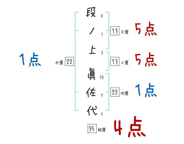 天運![]() | 段ノ上眞佐代さんの天運は13画の5つ星!才能に恵まれ人気がある。名声を手に入れる。円満な人生。 家系が持つ宿命的な運勢を表します。祖先から受け継いだ苗字ですので自分の力が及びません。家柄を象徴します。 |