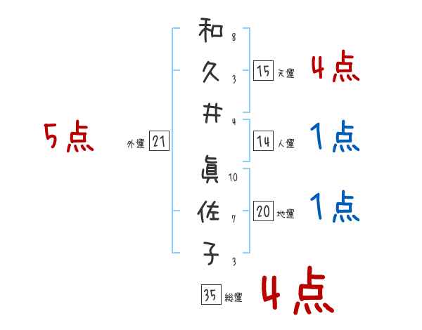 総運![]() | 和久井眞佐子さんの総運は35画の4つ星!温厚な性格で感受性が高い。穏和な性格で人望が厚い。 あなたの人生を表す1番重要な運勢です。生涯を通じて影響する総合運となり、主に50歳以降の晩年期に影響を及ぼします。 |