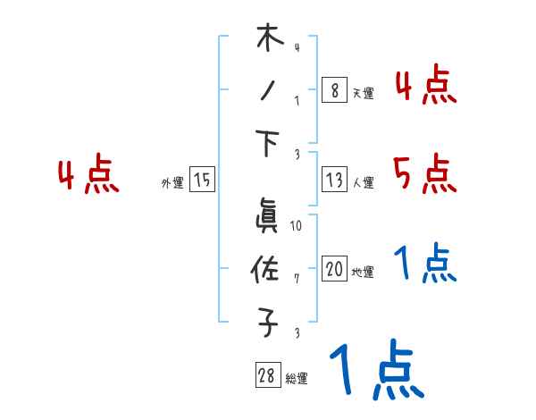 総運![]() | 木ノ下眞佐子さんの総運は28画の1つ星!家庭環境に注意。スポーツで活躍できる能力があるかも。 あなたの人生を表す1番重要な運勢です。生涯を通じて影響する総合運となり、主に50歳以降の晩年期に影響を及ぼします。 |