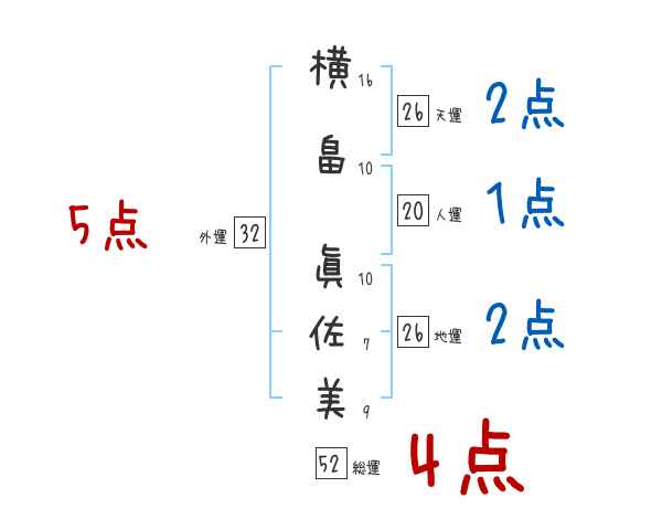 外運![]() | 横畠眞佐美さんの外運は32画の5つ星!柔軟性があり成功する。チャンスが多く金運が良い。 生活面を象徴する運勢です。外部から受ける影響力を表し、結婚運、家庭運や職場、環境への順応性を表します。 |