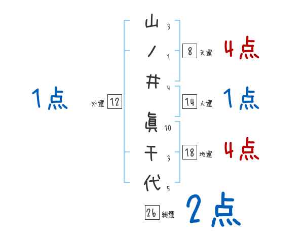 総運![]() | 山ノ井眞千代さんの総運は26画の2つ星!波瀾万丈かも。信頼できる人を大事にしましょう。 あなたの人生を表す1番重要な運勢です。生涯を通じて影響する総合運となり、主に50歳以降の晩年期に影響を及ぼします。 |