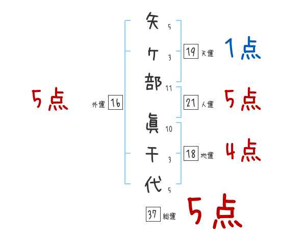 矢ヶ部眞千代さんの総運は37画の5つ星