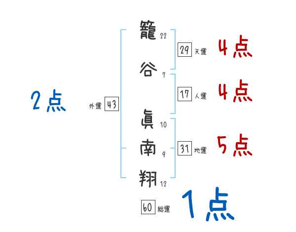 天運![]() | 籠谷眞南翔さんの天運は29画の4つ星!完全主義で才能がある。厳格な心の持ち主。 家系が持つ宿命的な運勢を表します。祖先から受け継いだ苗字ですので自分の力が及びません。家柄を象徴します。 |