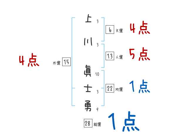 | 総運  | 上川眞士勇さんの総運は28画の1つ星!家庭環境に注意。スポーツで活躍できる能力があるかも。あなたの人生を表す1番重要な運勢です。生涯を通じて影響する総合運となり、主に50歳以降の晩年期に影響を及ぼします。 |