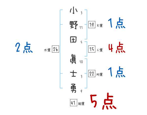 外運![]() | 小野田眞士勇さんの外運は26画の2つ星!波瀾万丈かも。信頼できる人を大事にしましょう。 生活面を象徴する運勢です。外部から受ける影響力を表し、結婚運、家庭運や職場、環境への順応性を表します。 |