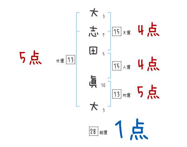 総運![]() | 大志田眞大さんの総運は28画の1つ星!家庭環境に注意。スポーツで活躍できる能力があるかも。 あなたの人生を表す1番重要な運勢です。生涯を通じて影響する総合運となり、主に50歳以降の晩年期に影響を及ぼします。 |