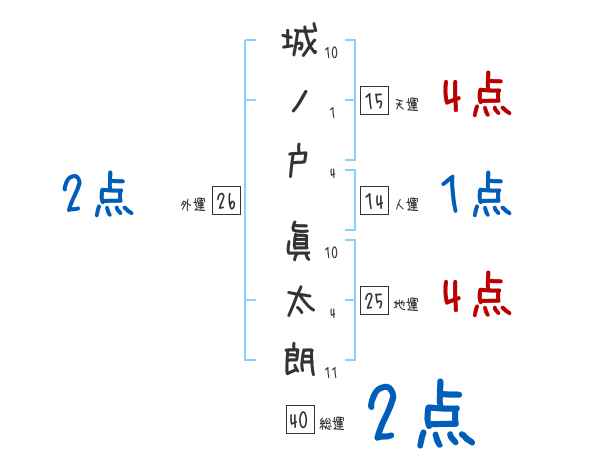 外運![]() | 城ノ戸眞太朗さんの外運は26画の2つ星!波瀾万丈かも。信頼できる人を大事にしましょう。 生活面を象徴する運勢です。外部から受ける影響力を表し、結婚運、家庭運や職場、環境への順応性を表します。 |