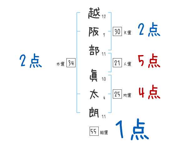 総運![]() | 越阪部眞太朗さんの総運は55画の1つ星!欲張りな性格で軽率な行動に注意しましょう。病気に気をつけて。 あなたの人生を表す1番重要な運勢です。生涯を通じて影響する総合運となり、主に50歳以降の晩年期に影響を及ぼします。 |