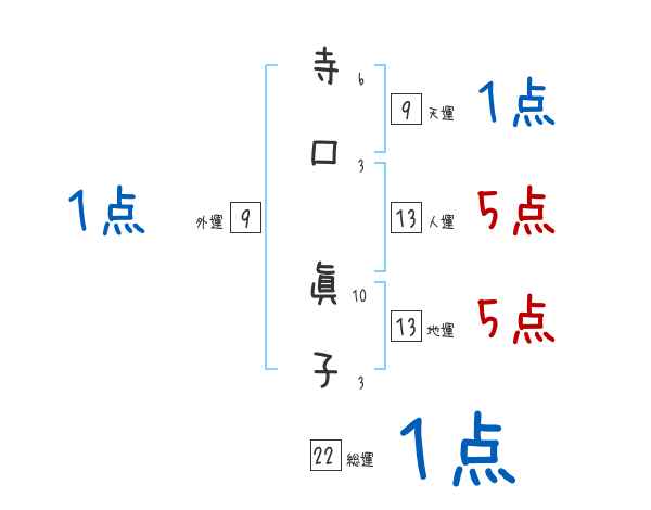 天運![]() | 寺口眞子さんの天運は9画の1つ星!消極的で才能を発揮することが苦手なことも。周りの意見に耳を傾けましょう。 家系が持つ宿命的な運勢を表します。祖先から受け継いだ苗字ですので自分の力が及びません。家柄を象徴します。 |
