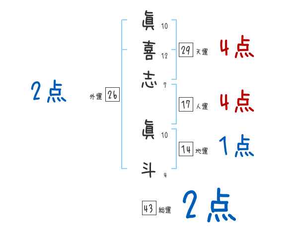 外運![]() | 眞喜志眞斗さんの外運は26画の2つ星!波瀾万丈かも。信頼できる人を大事にしましょう。 生活面を象徴する運勢です。外部から受ける影響力を表し、結婚運、家庭運や職場、環境への順応性を表します。 |