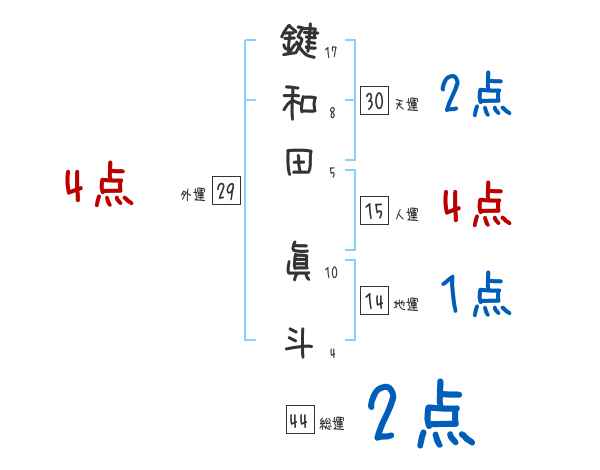 総運![]() | 鍵和田眞斗さんの総運は44画の2つ星!誠実で慎重な性格。物事を考えすぎないように注意しましょう。 あなたの人生を表す1番重要な運勢です。生涯を通じて影響する総合運となり、主に50歳以降の晩年期に影響を及ぼします。 |