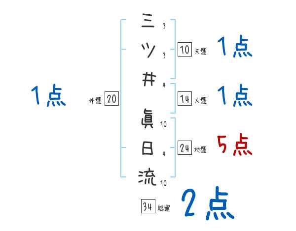 天運![]() | 三ツ井眞日流さんの天運は10画の1つ星!不安を感じやすい傾向。ストレスを抱えないように注意しましょう。 家系が持つ宿命的な運勢を表します。祖先から受け継いだ苗字ですので自分の力が及びません。家柄を象徴します。 |