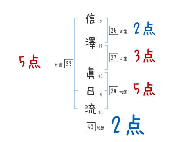 外運![]() | 信澤眞日流さんの外運は23画の5つ星!想像力に優れ活力がある。一代で成功し名誉を手に入れる。 生活面を象徴する運勢です。外部から受ける影響力を表し、結婚運、家庭運や職場、環境への順応性を表します。 |