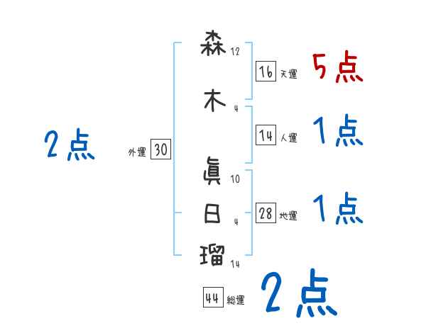 天運![]() | 森木眞日瑠さんの天運は16画の5つ星!人望が厚く大きく発展する。逆転成功が見える。 家系が持つ宿命的な運勢を表します。祖先から受け継いだ苗字ですので自分の力が及びません。家柄を象徴します。 |