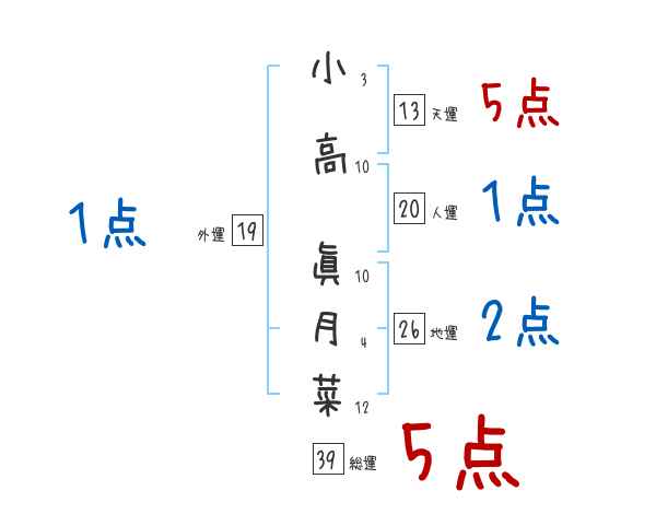 総運![]() | 小高眞月菜さんの総運は39画の5つ星!社交性に優れ人望が厚い。人の上に立ち成功する。 あなたの人生を表す1番重要な運勢です。生涯を通じて影響する総合運となり、主に50歳以降の晩年期に影響を及ぼします。 |
