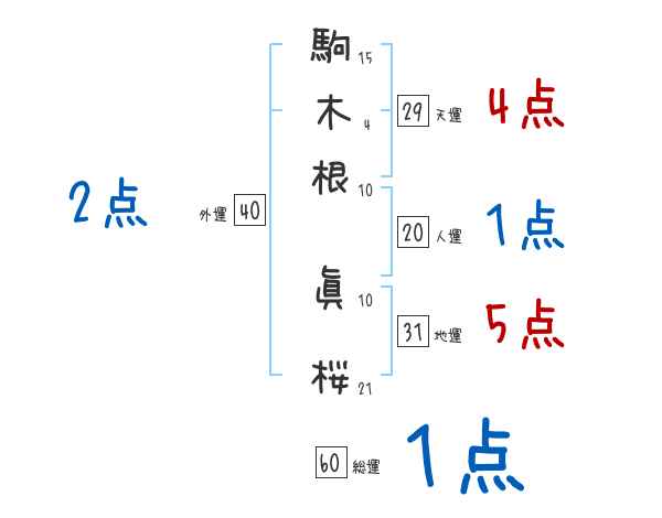 天運![]() | 駒木根眞桜さんの天運は29画の4つ星!完全主義で才能がある。厳格な心の持ち主。 家系が持つ宿命的な運勢を表します。祖先から受け継いだ苗字ですので自分の力が及びません。家柄を象徴します。 |