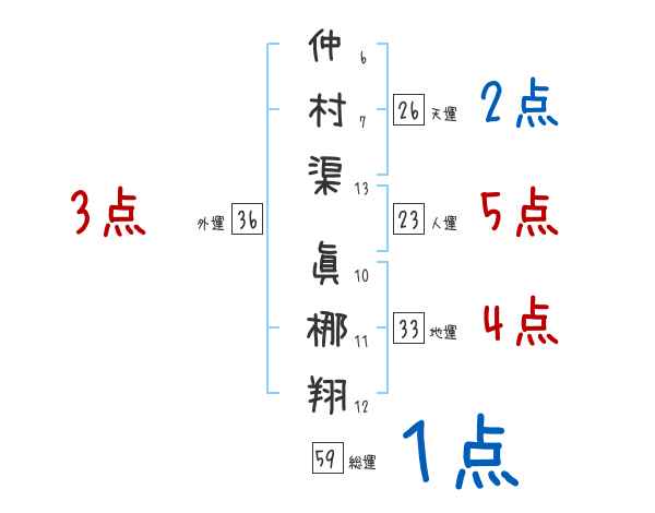 天運![]() | 仲村渠眞梛翔さんの天運は26画の2つ星!波瀾万丈かも。信頼できる人を大事にしましょう。 家系が持つ宿命的な運勢を表します。祖先から受け継いだ苗字ですので自分の力が及びません。家柄を象徴します。 |