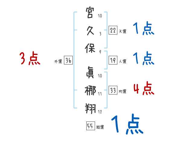 外運![]() | 宮久保眞梛翔さんの外運は36画の3つ星!先見性が豊かです。多少神経質で苦労することも。 生活面を象徴する運勢です。外部から受ける影響力を表し、結婚運、家庭運や職場、環境への順応性を表します。 |