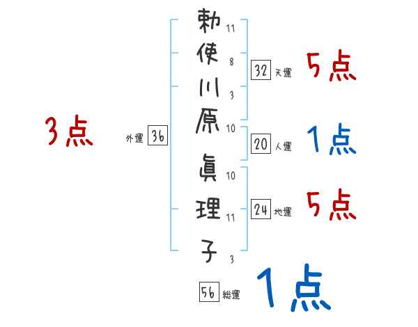外運![]() | 勅使川原眞理子さんの外運は36画の3つ星!先見性が豊かです。多少神経質で苦労することも。 生活面を象徴する運勢です。外部から受ける影響力を表し、結婚運、家庭運や職場、環境への順応性を表します。 |
