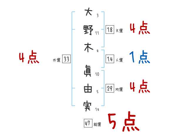 天運![]() | 大野木眞由実さんの天運は18画の4つ星!情熱的で剛気。忍耐力があり信頼される。 家系が持つ宿命的な運勢を表します。祖先から受け継いだ苗字ですので自分の力が及びません。家柄を象徴します。 |