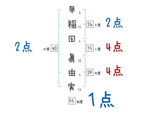 天運![]() | 早稲田眞由実さんの天運は26画の2つ星!波瀾万丈かも。信頼できる人を大事にしましょう。 家系が持つ宿命的な運勢を表します。祖先から受け継いだ苗字ですので自分の力が及びません。家柄を象徴します。 |