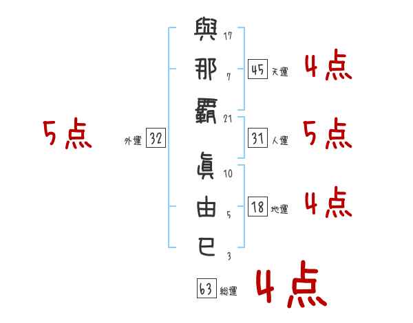 外運![]() | 與那覇眞由巳さんの外運は32画の5つ星!柔軟性があり成功する。チャンスが多く金運が良い。 生活面を象徴する運勢です。外部から受ける影響力を表し、結婚運、家庭運や職場、環境への順応性を表します。 |