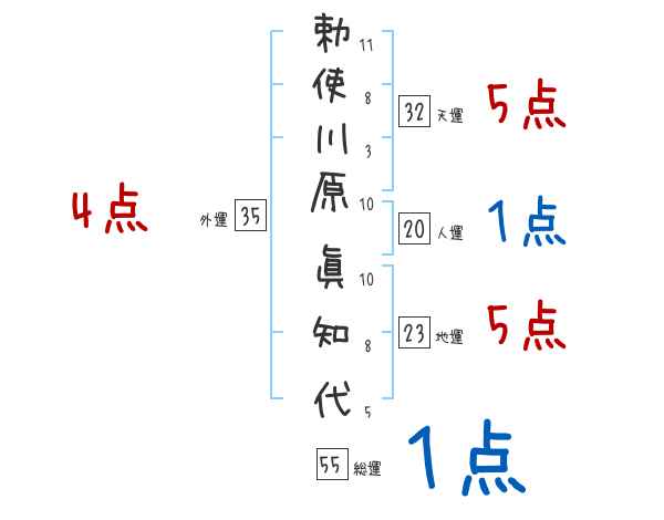 外運![]() | 勅使川原眞知代さんの外運は35画の4つ星!温厚な性格で感受性が高い。穏和な性格で人望が厚い。 生活面を象徴する運勢です。外部から受ける影響力を表し、結婚運、家庭運や職場、環境への順応性を表します。 |