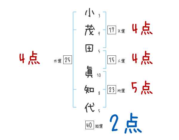 天運![]() | 小茂田眞知代さんの天運は17画の4つ星!積極的な行動力。地位を気づき財産を手に入れる。純粋な心と直感力。 家系が持つ宿命的な運勢を表します。祖先から受け継いだ苗字ですので自分の力が及びません。家柄を象徴します。 |