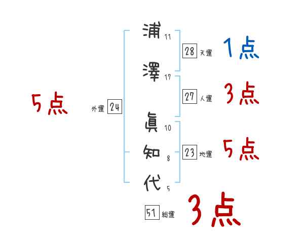 外運![]() | 浦澤眞知代さんの外運は24画の5つ星!家庭運が良く順調な人生。金運にも恵まれる。 生活面を象徴する運勢です。外部から受ける影響力を表し、結婚運、家庭運や職場、環境への順応性を表します。 |