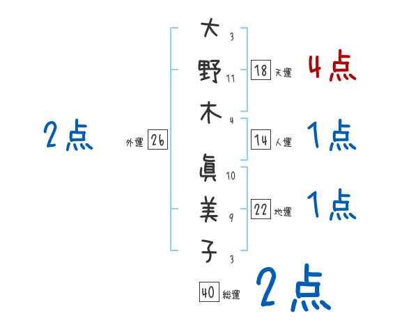 天運![]() | 大野木眞美子さんの天運は18画の4つ星!情熱的で剛気。忍耐力があり信頼される。 家系が持つ宿命的な運勢を表します。祖先から受け継いだ苗字ですので自分の力が及びません。家柄を象徴します。 |