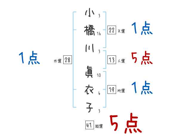 人運![]() | 小橋川眞衣子さんの人運は13画の5つ星!才能に恵まれ人気がある。名声を手に入れる。円満な人生。 性格や才能などを表す2番目に重要な運勢です。人間関係や協調性、社会的な成功に影響します。主に20歳から50歳ぐらいまでの中年期の運勢を表します。 |