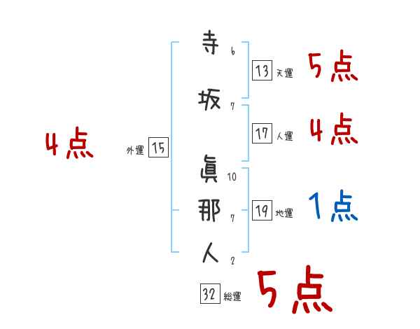 総運![]() | 寺坂眞那人さんの総運は32画の5つ星!柔軟性があり成功する。チャンスが多く金運が良い。 あなたの人生を表す1番重要な運勢です。生涯を通じて影響する総合運となり、主に50歳以降の晩年期に影響を及ぼします。 |