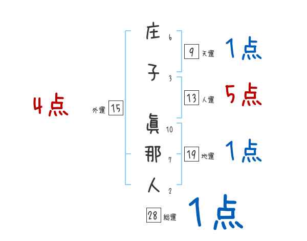 人運![]() | 庄子眞那人さんの人運は13画の5つ星!才能に恵まれ人気がある。名声を手に入れる。円満な人生。 性格や才能などを表す2番目に重要な運勢です。人間関係や協調性、社会的な成功に影響します。主に20歳から50歳ぐらいまでの中年期の運勢を表します。 |